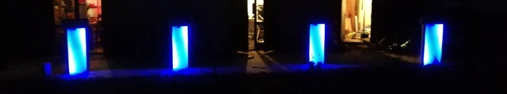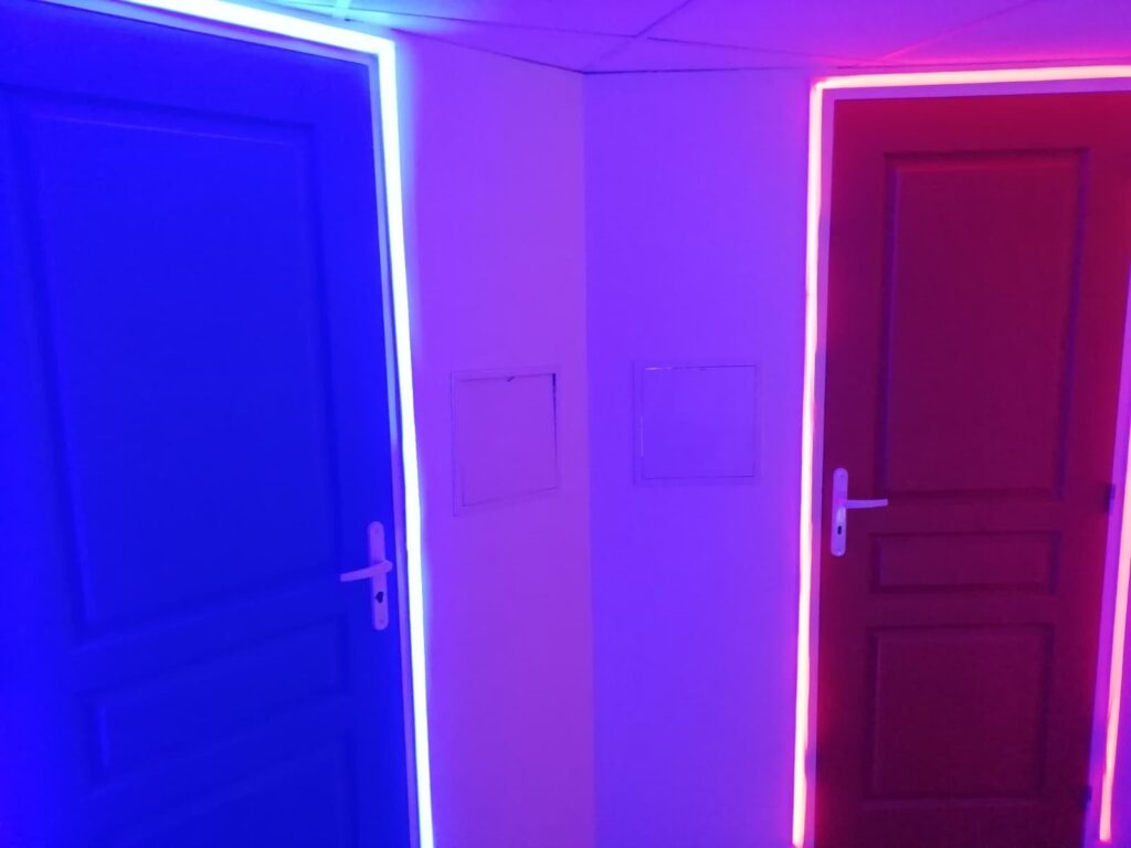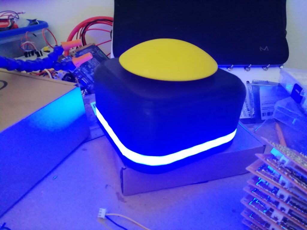 Buzzers connectées fonctionnant sur batterie (2 accus 18650), composées d’un gros bouton et d’une bande de LEDs RGB.