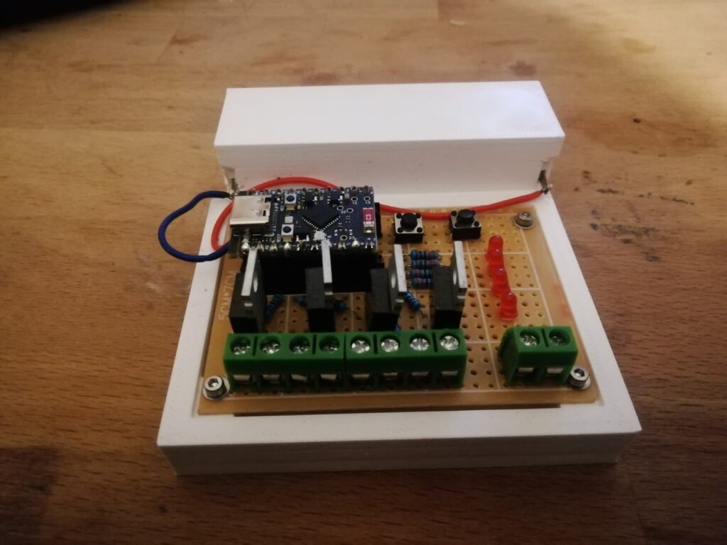 Pupitre connecté composé de 2 bandes de LEDs RGB et de 3 boutons.